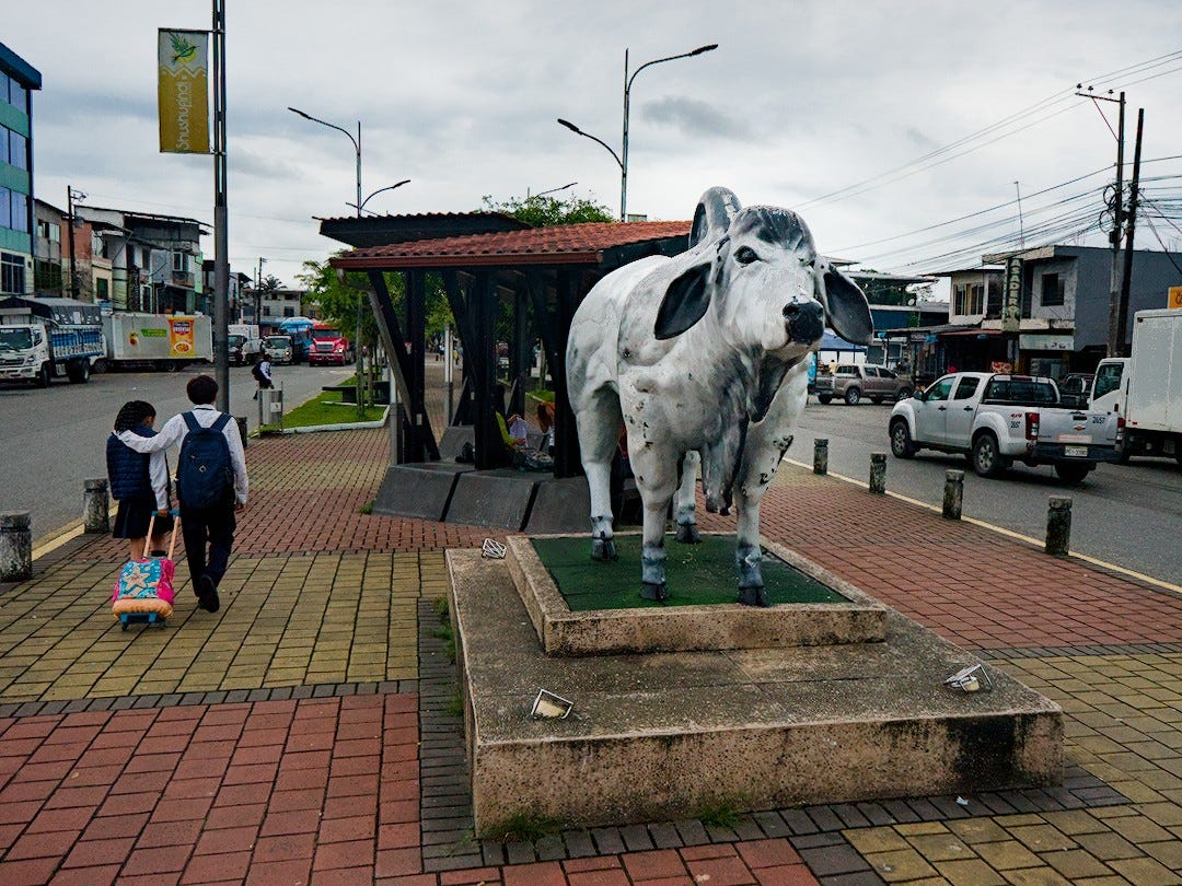 We stop for coffee in a small town: little more than a single road lined with houses. The Amazon’s untamed green expanse is nowhere to be found, replaced by cattle farms. A large statue of a cow decorates the main street.