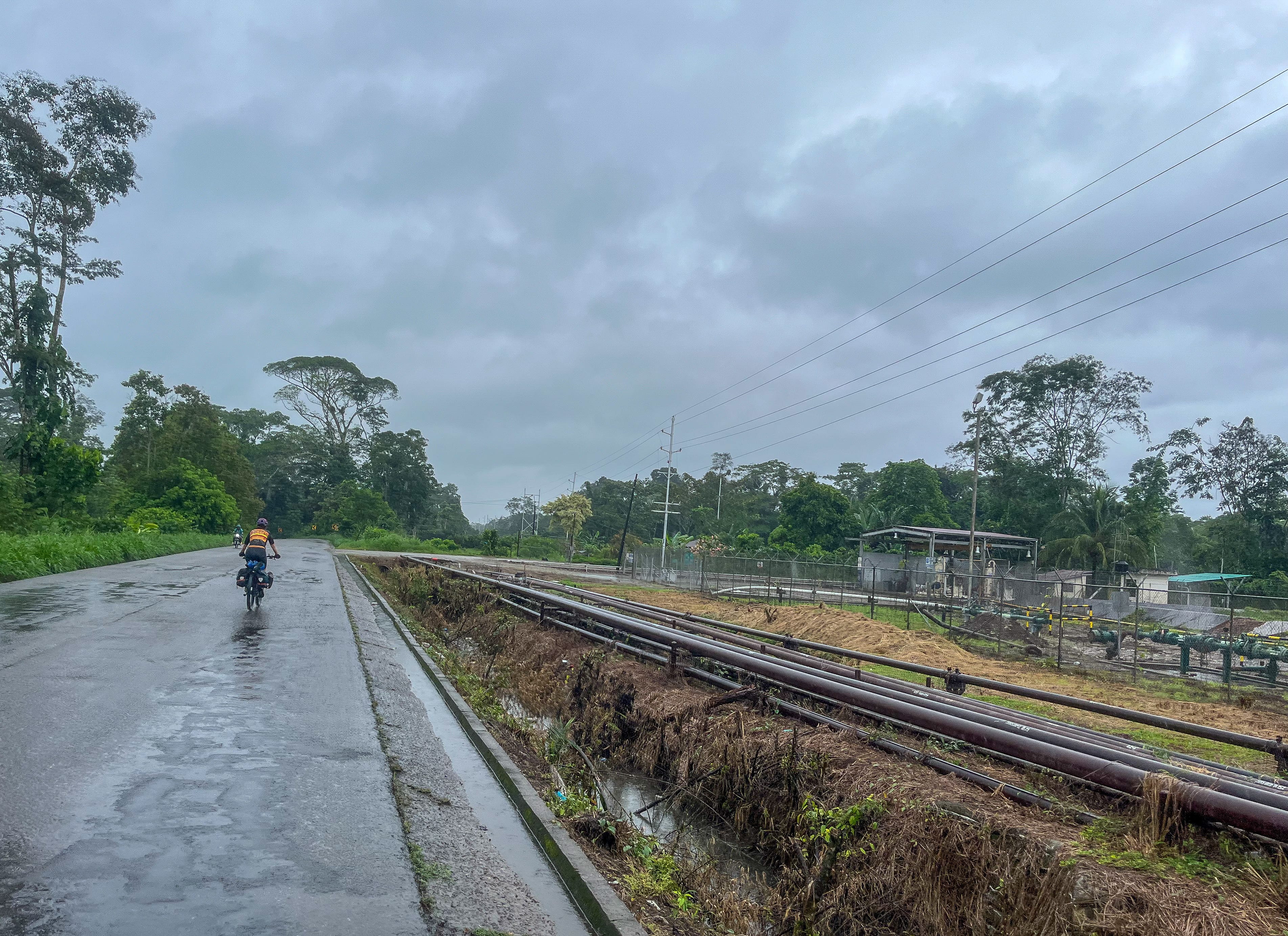As we cycle deeper into the Amazon, oil pipes run parallel to pretty much every road, too. They differ from the ones we saw in Colombia in that they are bigger, more imposing, and actively in use.