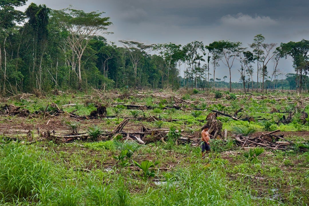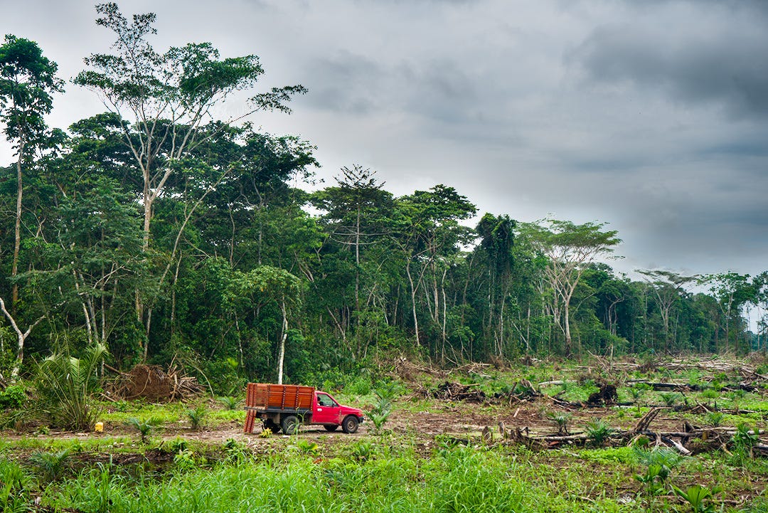 It turns out, it’s also deceptive. The corridor lasts just a few kilometers and then opens up. Soon, I see a patch of recently deforested land on the edge of a virgin rainforest. A man gets out of a beat-up pickup truck to inspect the first rows of banana plants that will soon erase any traces of the jungle.