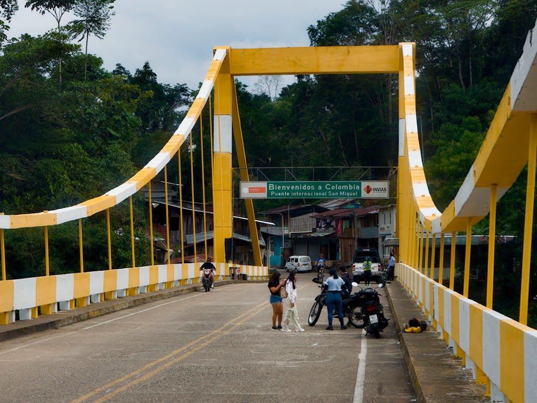 From La Hormiga, we continue to follow the pipeline, which eventually brings us to the border crossing. A narrow yellow bridge spans the San Miguel River, connecting the two countries. It is quiet, just a few day-trippers taking selfies. The bustle of bigger border crossings – vendors hawking SIM cards, offering currency exchanges, or rushing you into a taxi – is unimaginable here.